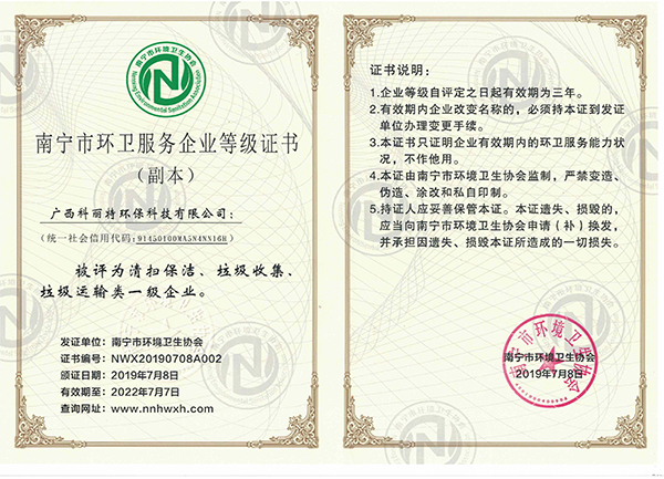 南(nán)甯市環衛服務企業等級證書(shū)(一級)